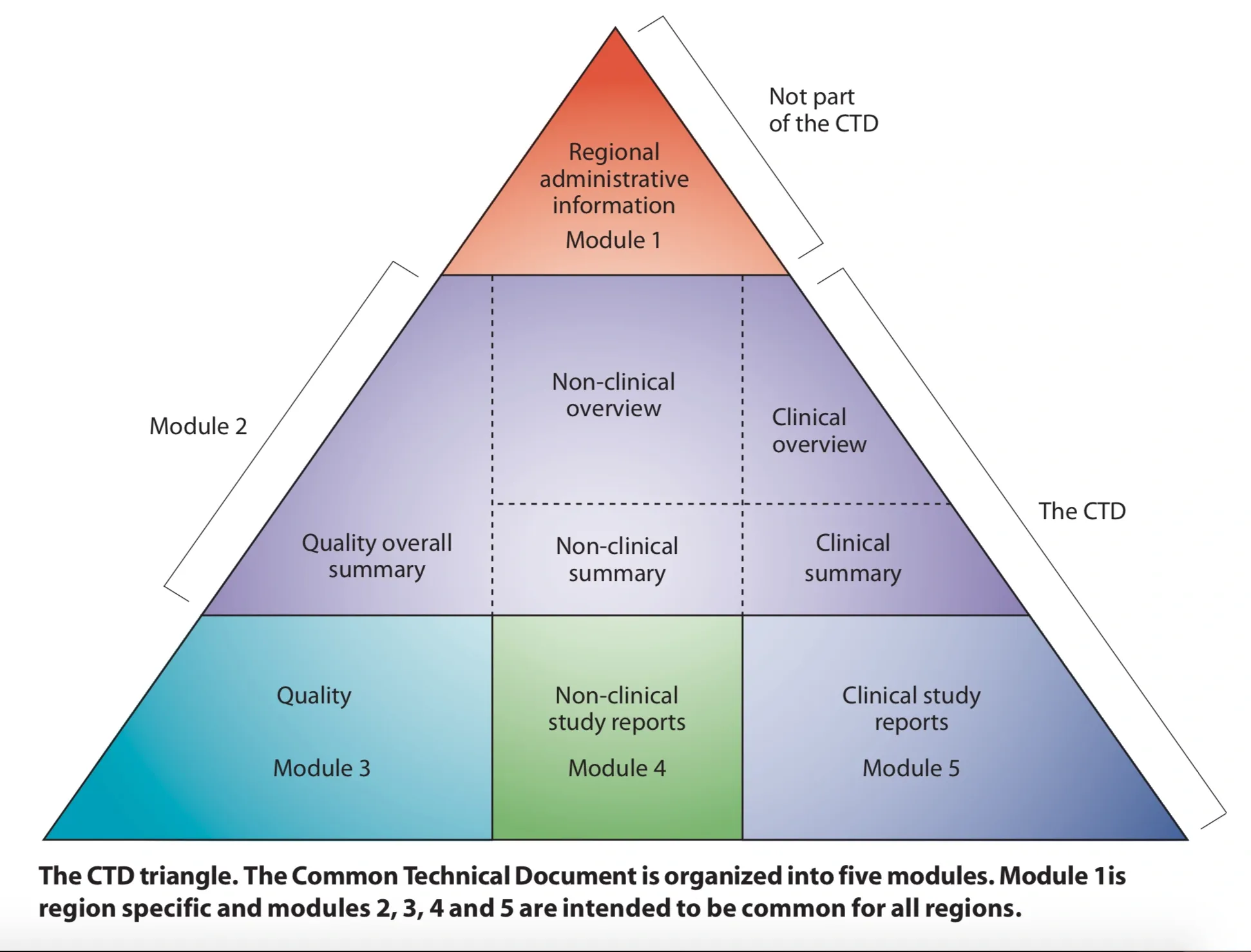 Part of what makes the CTD so useful is its internal structure. We can look at the Quality Overall Summary (QOS) as an example (see the M4Q guidance for reference). The guidance table of contents shows the exact structure of the QOS and each section or subsection of the actual application will be numbered as shown in the table of contents. For example, in the QOS, which will be section 2.3 (corresponding to Module 2 section 3), the drug substance is described in section 2.3.S, with subsections 2.3.S.1-7 giving the individual parts of the summary for drug substance. One can quickly recognize section P must represent drug product, and sections A and R quite naturally lend themselves to Appendices and Regional Information. This module.section.subsection format applies to the entire CTD, and enables rapid identification of any part of the document based on these identifiers. In my next post I’ll discuss what makes the eCTD work.